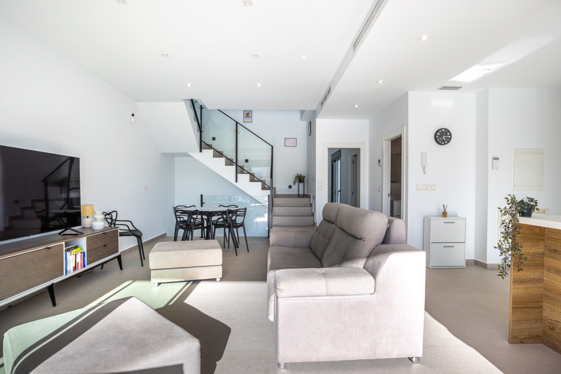 Beim Betreten der Villa empfängt Sie ein heller und geräumiger offener Wohnbereich, in dem klare architektonische Linien und große Fenster eine luftige, moderne Atmosphäre schaffen. Die voll ausgestattete Küche fügt sich elegant in den Raum ein und verfügt über hochwertige Elektrogeräte – Stil und Funktionalität vereint – ideal für den Alltag oder zum Bewirten von Gästen.