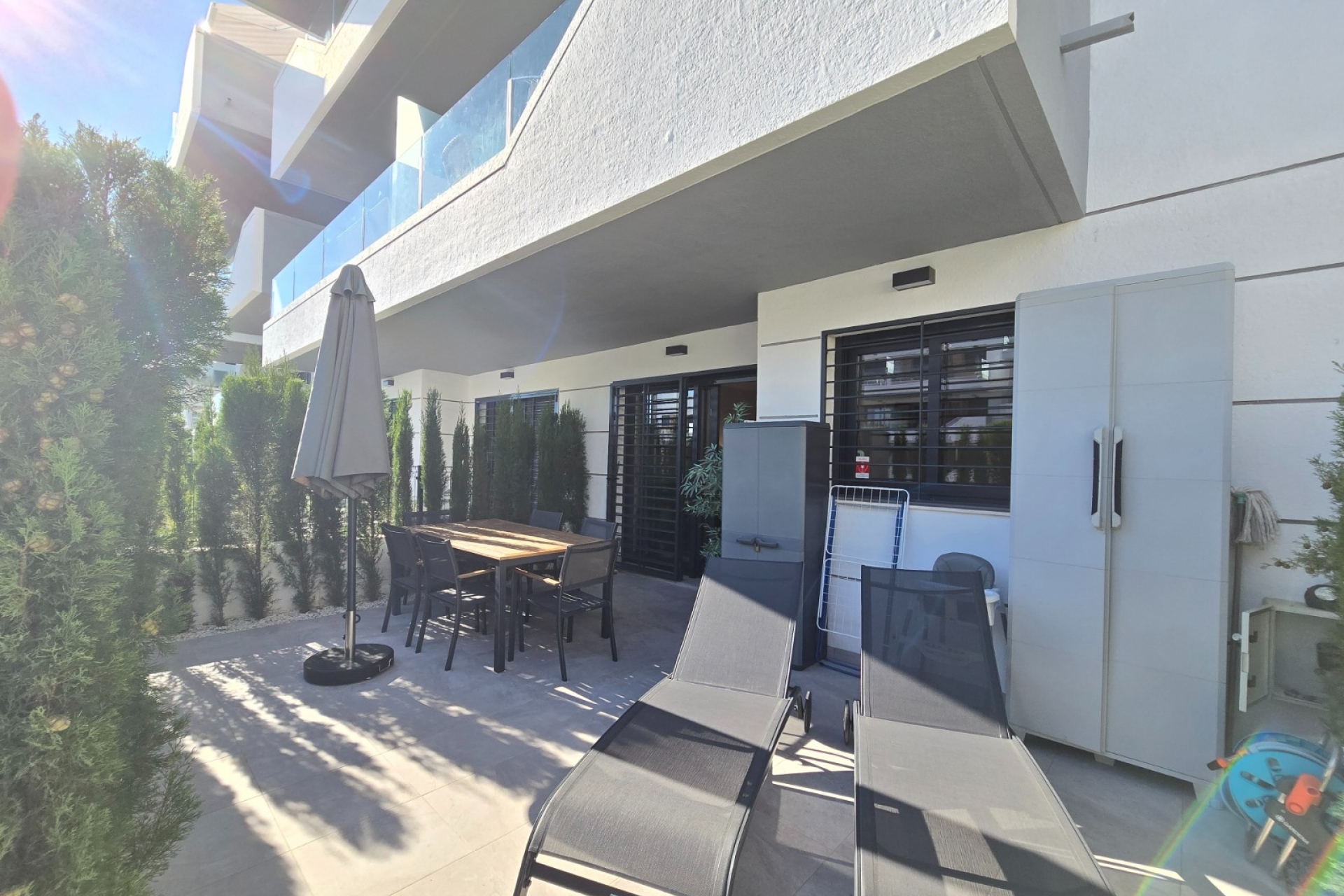 La vivienda cuenta con 2 dormitorios y 2 modernos cuartos de baño, uno de ellos en suite. La cocina abierta está totalmente equipada y se integra a la perfección en el luminoso salón, con acceso directo a la amplia terraza. Desde aquí se disfruta de acceso directo al bonito jardín comunitario, con piscina y jacuzzi, ideal para relajarse y disfrutar del clima mediterráneo.