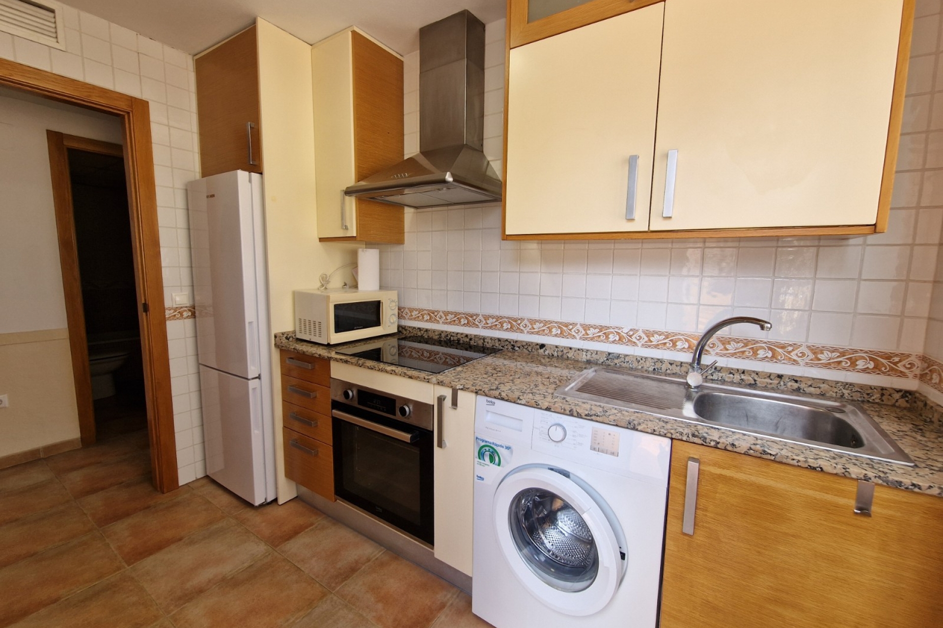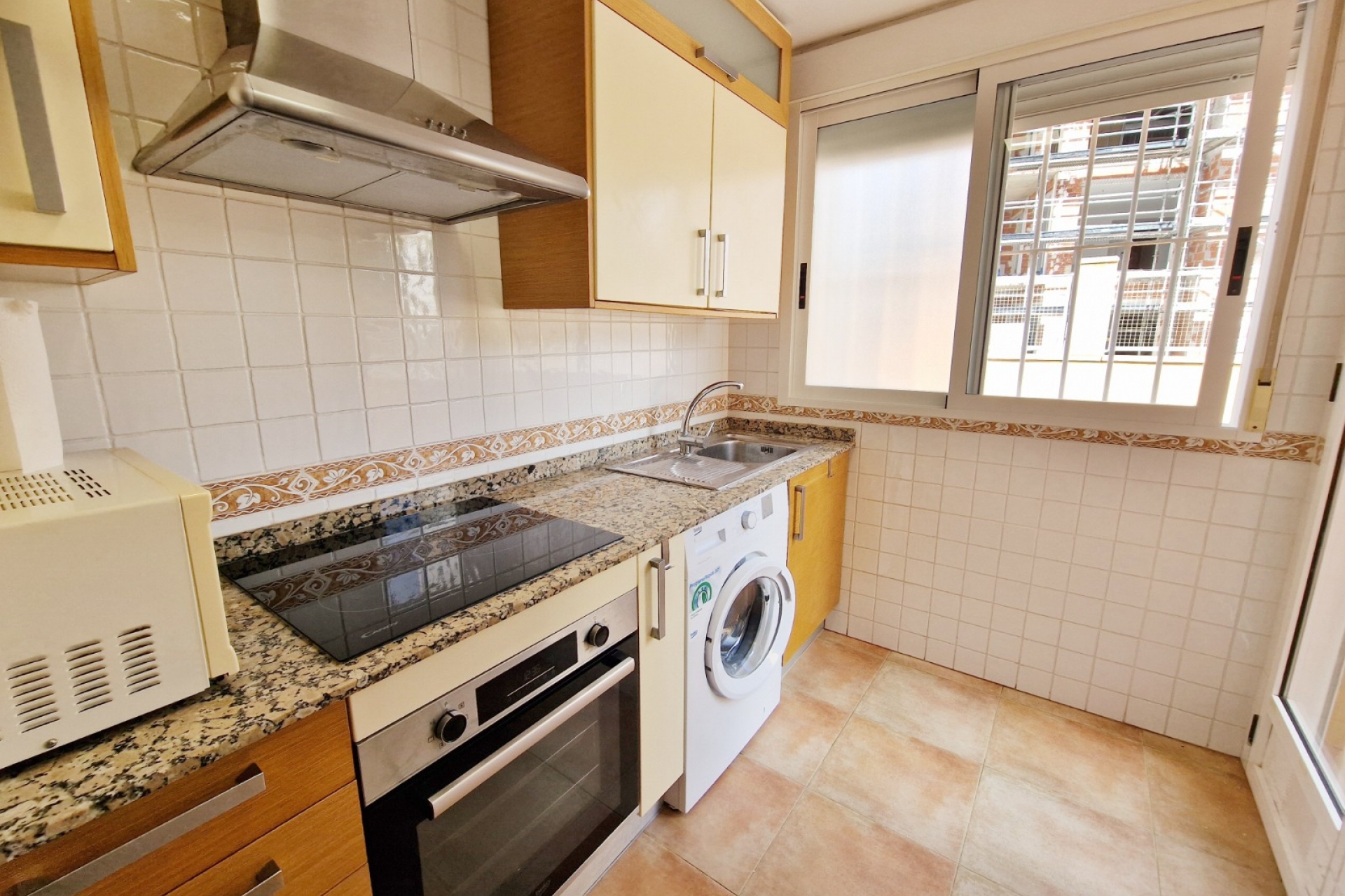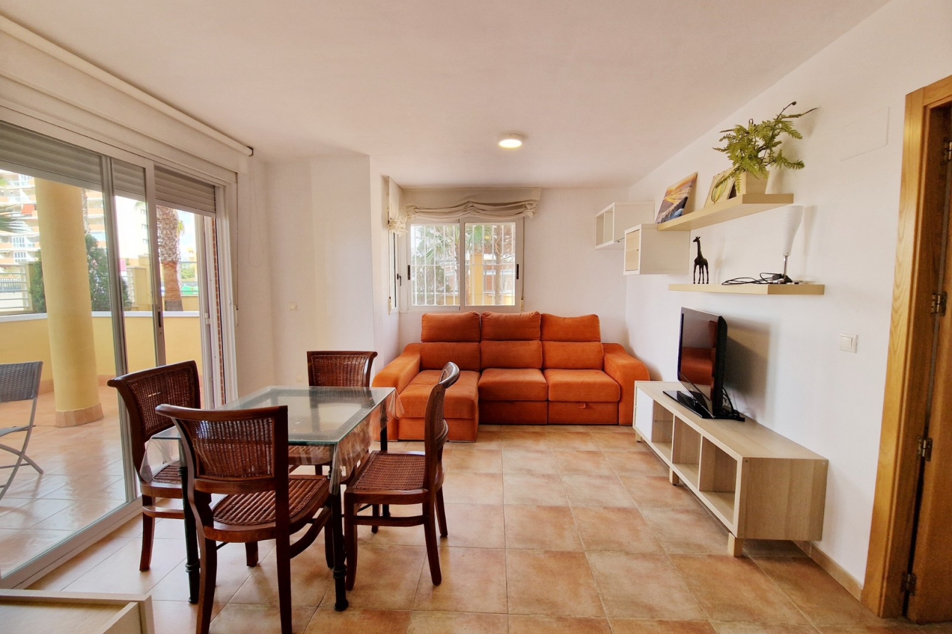 Dit appartement te koop in Guardamar del Segura heeft een west-oriëntatie , waardoor er de hele dag door veel natuurlijk zonlicht is. Bij binnenkomst vindt u een lichte en luchtige woonkamer die directe toegang biedt tot het terras aan de voorzijde , dat zich in de gated community bevindt. Deze buitenruimte is perfect om te genieten van het warme mediterrane klimaat, te ontspannen of buiten te eten.