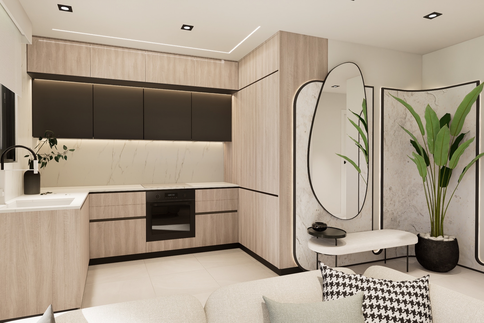 Het interieur van de bungalows is zorgvuldig ontworpen om een functionele en uitnodigende ruimte te bieden. De indelingsopties omvatten woningen met 2 of 3 slaapkamers en 2 badkamers, die zich aanpassen aan verschillende gezinsbehoeften. De porseleinen tegelvloeren geven een vleugje elegantie en zijn gemakkelijk te onderhouden. Elektrische rolluiken en ingebouwde kasten voegen comfort en praktisch nut toe aan het dagelijks leven. De voorinstallatie van airconditioning stelt bewoners in staat om de klimaatregeling van hun huis aan te passen, wat zorgt voor een aangename sfeer gedurende het hele jaar.