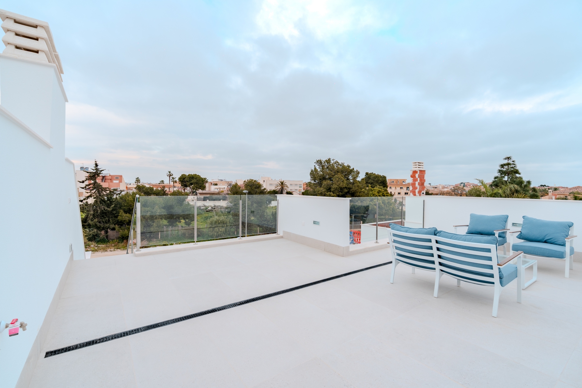 The exteriors of these townhouses are designed to maximize enjoyment of the Mediterranean climate. Each home features a private garden, ideal for creating a personal green space or enjoying outdoor moments. The spacious terraces offer a perfect place to relax, sunbathe, or enjoy outdoor meals. Additionally, each townhouse includes a solarium, providing extra space to enjoy the views and sunny weather year-round. The presence of a garage ensures convenience and security for vehicle parking.