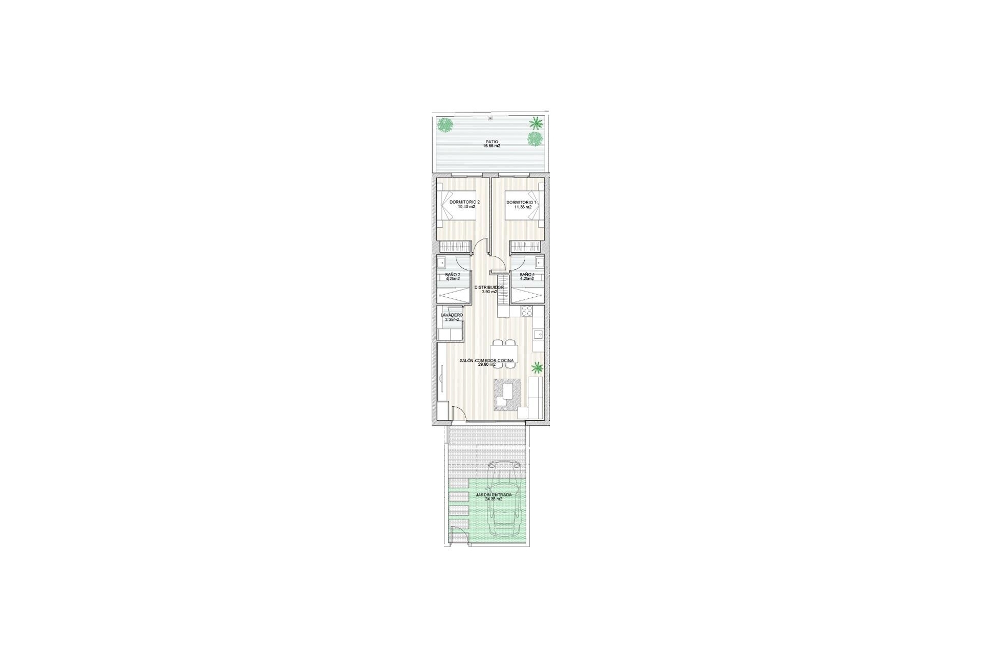 The bungalow offers 78.99 m² of living space, featuring a spacious living room with an open-plan kitchen, 2 bedrooms and 2 bathrooms. It also comes with a 49.25 m² private plot with a terrace for relaxation and private parking for 1 car + bicycles. Inside – high-quality materials, modern design, smart layout, air conditioning and heating. Outside – your own private plot with parking, perfect for leisure and relaxation. Enjoy panoramic views of the park and the sea, in a quiet green area near the beaches of Lo Pagán and the Mar Menor. Energy efficiency class: A+ These stylish bungalows are perfect both for year-round living and as a great investment opportunity.