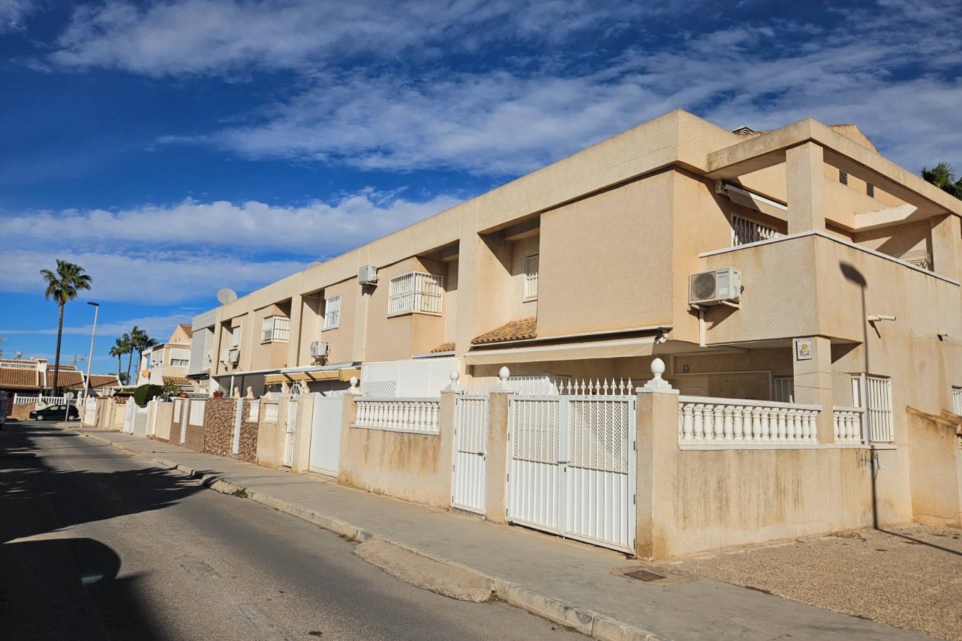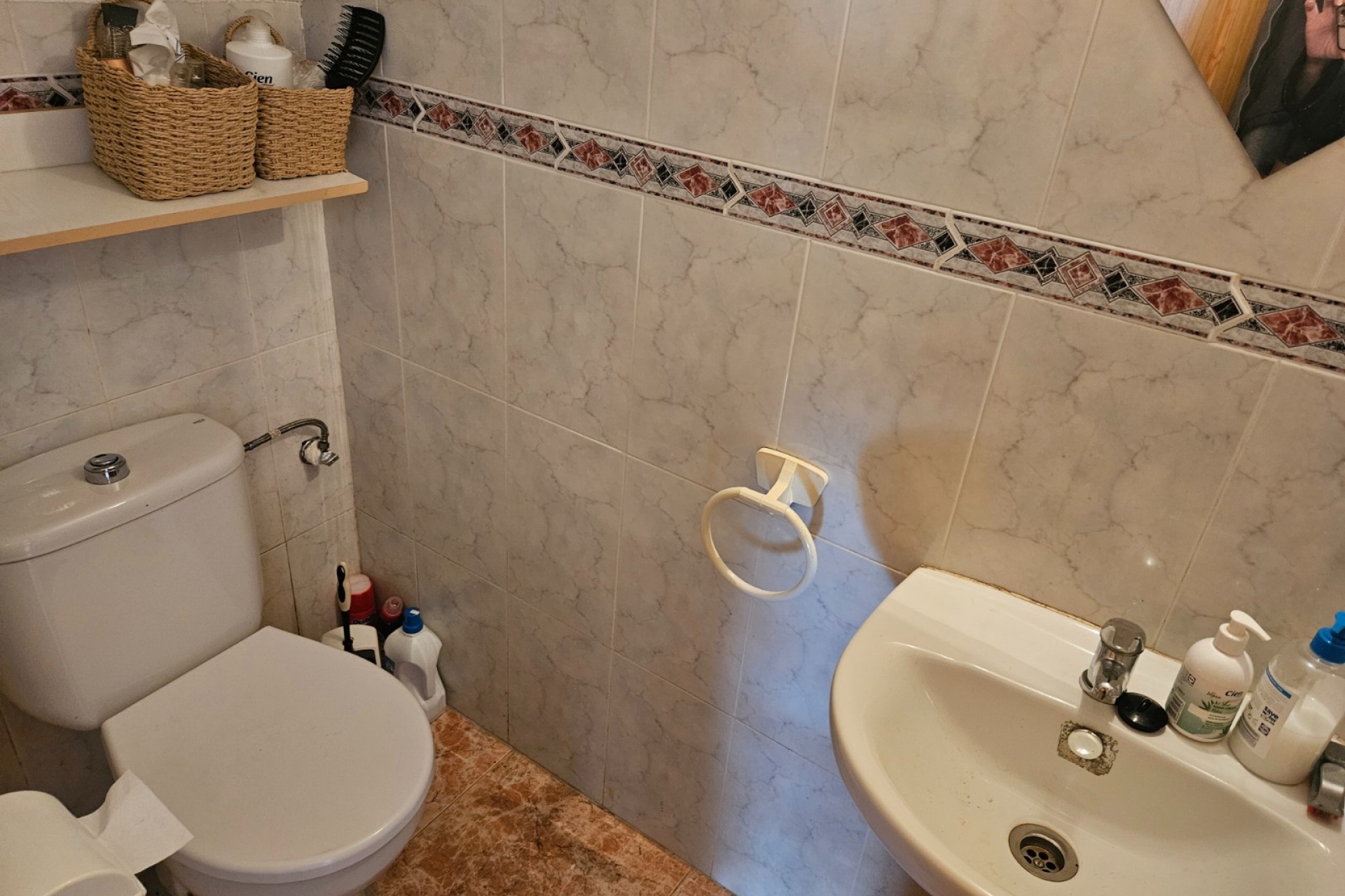 Charming townhouse for sale in the very popular area of Aguas Nuevas, Torrevieja with 2 bedrooms and a bathroom with shower on the upper floor. On the ground floor, you will find a cosy living room, a fully fitted kitchen and a practical toilet. The house has a spacious terrace of 35 m2 and a total surface area of 61 m2, with a south orientation that allows you to enjoy plenty of natural light.